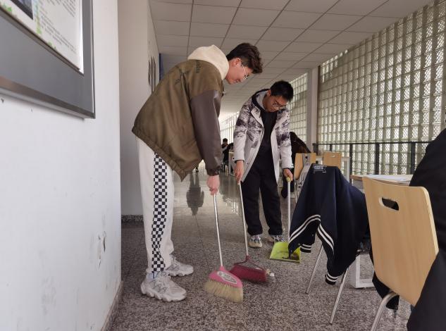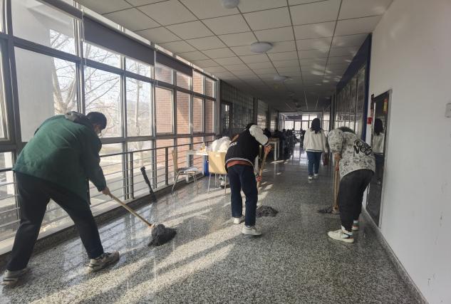 支部党员在化工与材料学院办公楼内清理楼道卫生