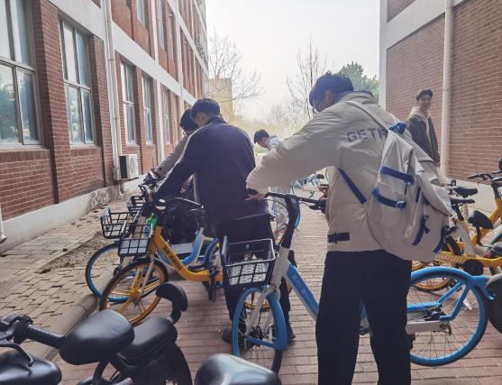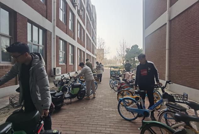 支部党员在化工与材料学院办公楼外单车摆放处将电动车与自行车摆放整齐