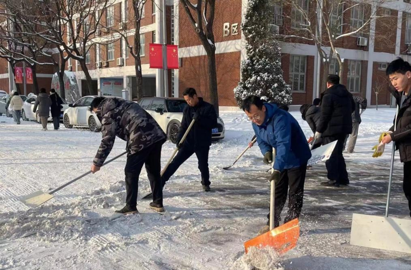 为深入贯彻党的教育方针,大力弘扬劳动精神,切实保障师生安全出行,化工与材料学院以雪情为命令,于12月15日清晨开展“我为群众办实事,破冰除雪践初心”劳动教育主题党日活动,学院领导班子带头,百余名专业教师、辅导员、学生党员齐上阵清除冰雪。
