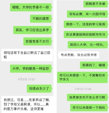 疫情网课期间,学弟表现出了思想上的迷茫,徐学长积极与学弟在网上联系交流,了解了学弟的迷茫后,徐学长鼓励学弟积极适应大学的节奏,不断摸索,培养自己的自觉性。建议学弟走出宿舍,学会控制自己,多去图书馆感受学习氛围,慢慢地培养学习兴趣,并帮助学弟疏通心事。学长帮助学弟认真地剖析学习方法,带学弟看清晨阳台的英语考研人,带他去聆听图书馆沙沙的写字声,帮学弟认识到大学的意义所在,鼓励学弟迅速走出负面情绪,以积极阳光的心态迎接大学美好生活。