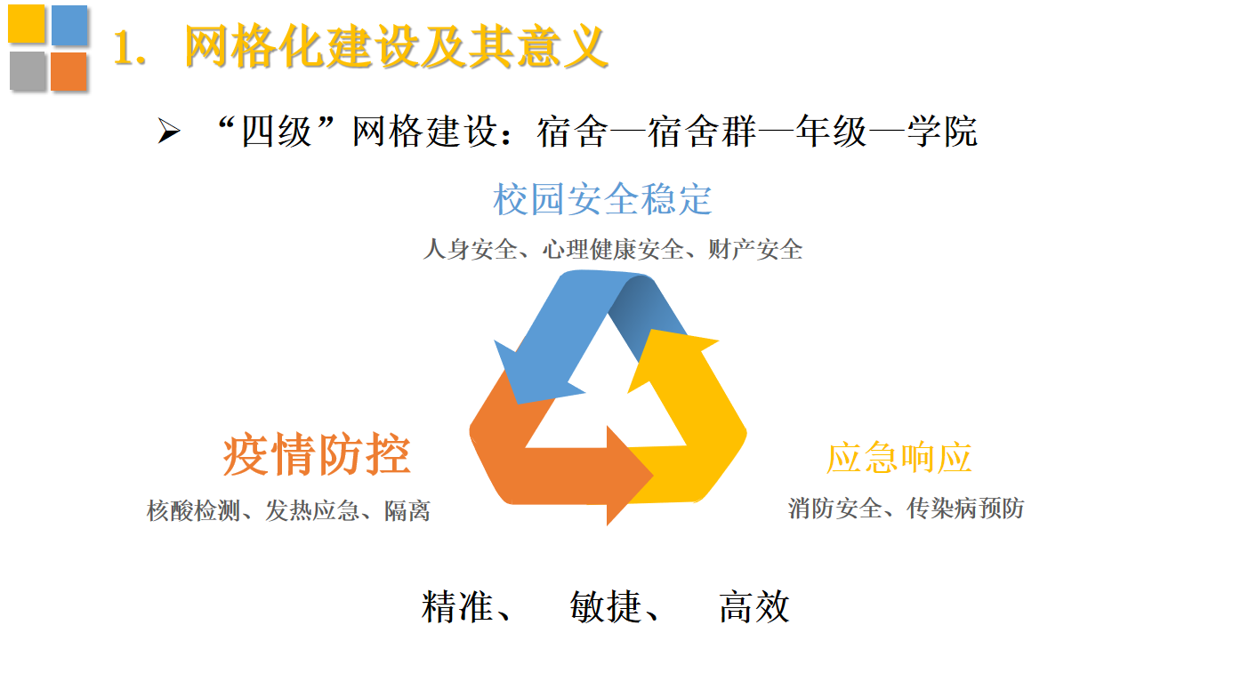首先,由2019级辅导员杨静介绍了“四级”网格建设、网格化建设的意义以及网格员职责。随后,各年级网格员代表及辅导员对网格化日常管理工作进行了经验分享。大家相互借鉴,互相吸收,共同进步。