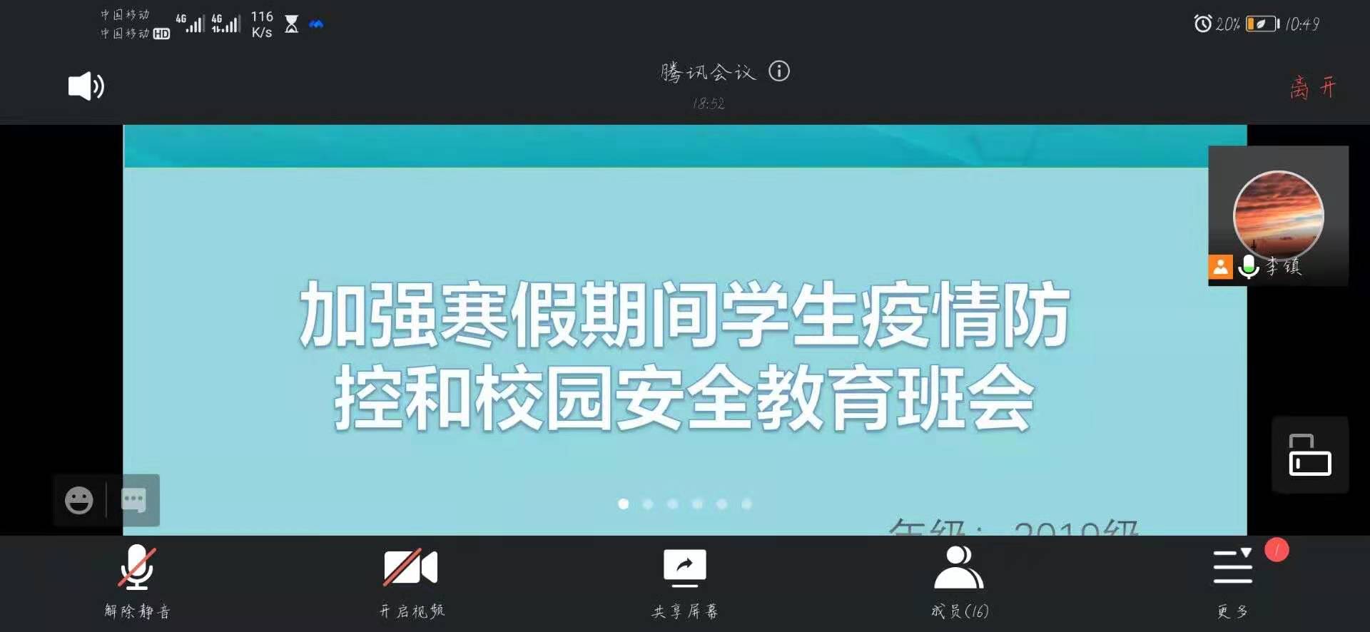 各年级辅导员结合本年级学生特点通过线上会议形式向全体学生传达学校疫情防控相关要求,宣教疫情期间科学防控知识,倡导戴口罩、勤洗手、一米距、公筷制等卫生行为,提高广大学生对疫情防控的正确认识和自我防护能力。通过对学生进行关心关怀,引导学生以健康心态积极面对疫情,教育学生寒假期间提高安全防范意识、增强自我保护能力、保障人身财产安全,同时,引导广大学生合理利用假期时间加强学习、充实自我。会上,辅导员强调学生在校期间应遵守学校规章制度,及时上报个人信息,居家期间应遵守当地疫情防控管理要求,遵纪守法,通过疫情防控期间因违反学校请假离校手续而受到相关处理的实际案例,以案为警。