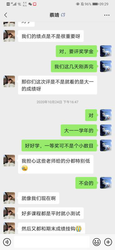 张研学姐自十月份认识蔡靖学妹以来,主动对学妹进行选课指导,讲解个性化课程所修学分及其注意事项,解答体育课选课问题,提醒学妹仔细核对必修课,关心考试成绩,积极为其解难解惑,帮助学妹疏通学习、心理压力。在她看来作为关怀学长,不仅仅能帮助学弟学妹们,更能帮助自己树立榜样意识,更好的努力提升自己。