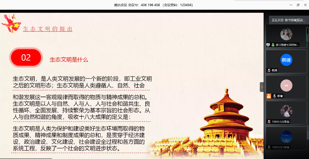 宣讲会伊始,化工与材料学院2019级学生谢玉洁带领各位学生回顾了从农耕时代到生态时代生态文明建设发展的历史和特点,“生态文明是人与人、人与社会、人与自然和谐共生、良性循环、全面发展和持续繁荣的文化伦理形态”。